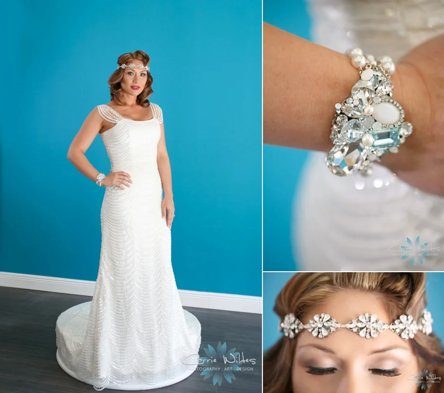 Style - Gatsby: A Modern Trousseau italian sequined and silk crepe wedding gown fashioned into a 1920's style with a scoop neckline and delicate straps accessorized with swarovski crystal headpiece and matching bracelet.