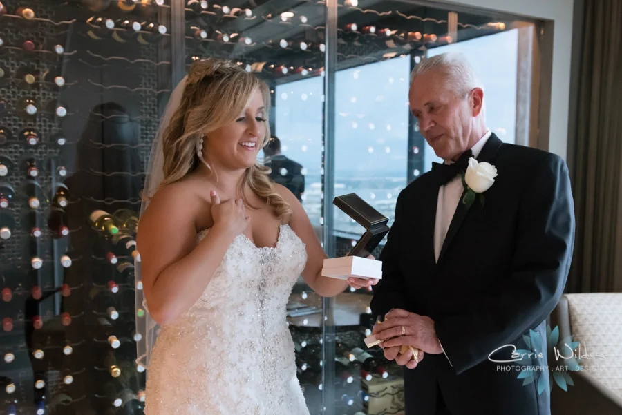 Jennifer and Bo's wedding was with the view of the city from the 42nd floor at the Tampa Club. Jen loves everything pink and had different shades of blush and pink throughout all her details. I especially love those Steve Madden heels and their custom wedding Snap Chat filter:-) Jen's dad was waiting to see her as we got to the Tampa Club, he gave her a beautiful necklace as a gift. Bo and all his groomsmen race motocross, and he got them each cufflinks with their racing number on them. Bo's is 419 and his groom's cake was an exact replica of his racing jacket! Their cake topper was even a gold motocross bike with a bride and groom. Their ceremony was lined with gold candles, pink flowers, and white draping. Reverend DeArruda talked about how Jen and Bo's sense of humor, and way they live their lives together really compliments each other. Once their were the official Mr & Mrs we got to use all the unique places there for photos. As you can see their bridal party is pretty fabulous and so much fun!! That gold texture wall and the wine room are so cool. The reception had gold, sequins, and candles everywhere! Their favors were custom engraved cigars and boxes of matches that said "The Perfect Match". Jen's maid of honor talked about how happy she is that Jen found someone who makes her laugh all the time. Bo's best man joked about how Bo had told him that he was in trouble because he had found the love of his life. They danced and danced and danced until it was time to end the evening under of flurry of confetti! Congrats Jen and Bo everything was truly stunning and we were so honored to be a part of it!!