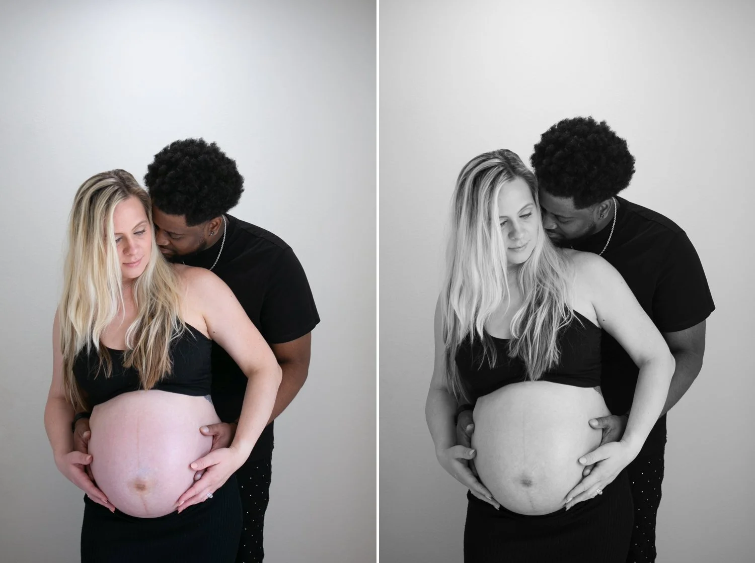 When we started planning their maternity session, we talked through different ideas and ultimately landed on a clean, intimate look that felt very “them.” We decided to photograph this session in our lifestyle studio, which turned out to be the perfect choice—especially with how hot it gets in Florida in July! The simple, neutral backdrop allowed their connection and the anticipation of baby girl’s arrival to take center stage.