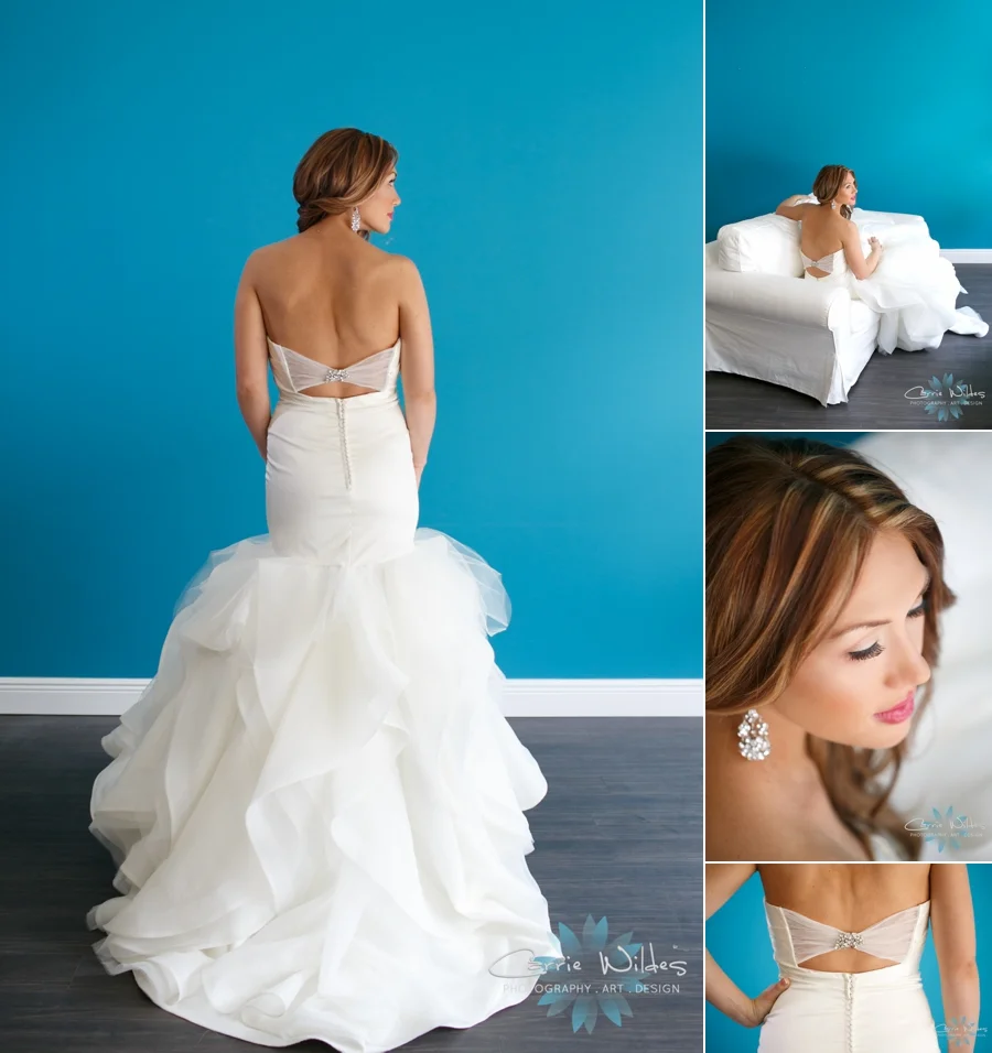 Style: Sexy - A Hayley Paige stretch satin and organza fit-to-flare bridal gown with an open back and tulle detailing connected by a jeweled brooch and accessorized with a chandellier earring.
