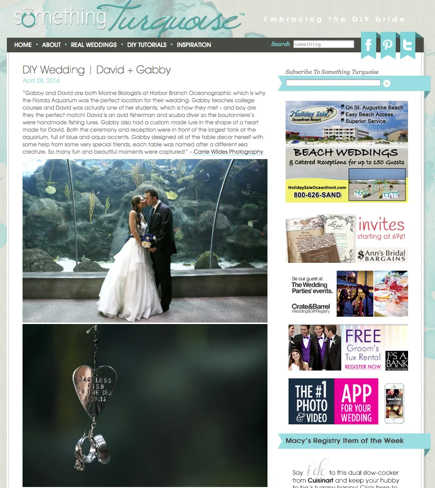 Gabby & David's DIY Florida Aquarium wedding is featured on Something Turquoise today! Read about what they DIY'd, favorite wedding memory, wedding advice and more!